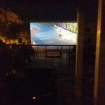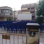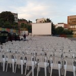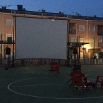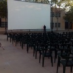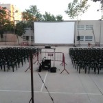 La imagen muestra un evento de cine al aire libre organizado por MovieMovil en el patio de un colegio en Banyeres de Mariola, como parte de las fiestas de la Malena. Una gran pantalla está montada frente a un edificio con ventanas verdes, mientras filas de sillas blancas están dispuestas para acomodar al público. El suelo pavimentado y los detalles del entorno reflejan la atmósfera festiva y comunitaria del evento. MovieMovil, la empresa de cine al aire libre, transforma cualquier espacio en una experiencia cinematográfica inolvidable.