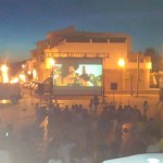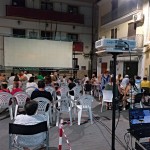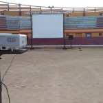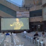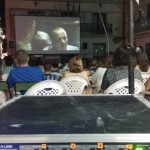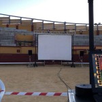 La imagen muestra un evento organizado por MovieMovil en una plaza de Petrer, donde se rinde homenaje a un torero frente a la puerta de su casa. Una gran pantalla proyecta imágenes relacionadas con el mundo taurino, incluyendo figuras en trajes tradicionales de toreo. El público, sentado en sillas, disfruta del evento en un ambiente comunitario y emotivo. MovieMovil, la empresa de cine al aire libre, transforma espacios públicos en escenarios para eventos únicos y memorables.