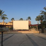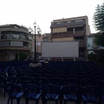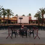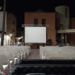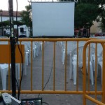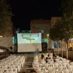 La imagen muestra un evento de cine al aire libre organizado por MovieMovil en la plaza de la iglesia de El Campello, Alicante. Una gran pantalla blanca bordeada en negro está instalada sobre una plataforma decorada con franjas amarillas y naranjas, mientras luces decorativas suspendidas añaden un toque festivo al ambiente. El entorno incluye edificios cercanos, uno con balcón y banderas, además de una farola que proyecta sombras en el suelo. Este evento combina la magia del cine con la belleza arquitectónica del entorno, ofreciendo una experiencia única para los vecinos y visitantes de El Campello. MovieMovil, la empresa de cine al aire libre, convierte espacios emblemáticos en escenarios perfectos para disfrutar del séptimo arte.