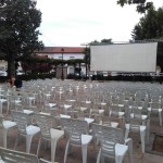 La imagen muestra un evento de cine al aire libre organizado por MovieMovil en el parque «9 de octubre» de Petrer. Una gran pantalla blanca está instalada en un escenario cubierto, con filas de sillas blancas dispuestas para los asistentes. El entorno natural, con árboles y césped, crea un ambiente relajado y acogedor para disfrutar del cine bajo las estrellas. MovieMovil, la empresa de cine al aire libre, convierte espacios públicos en escenarios mágicos para el séptimo arte, ofreciendo experiencias únicas para la comunidad.