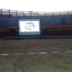 La imagen muestra una pantalla de cine al aire libre instalada en el antiguo campo de fútbol de Monóvar. La pantalla proyecta luces coloridas en movimiento, creando una atmósfera vibrante que acompaña el ritmo de la música. En el lugar, el público se sienta y disfruta del espectáculo en una disposición de sillas de plástico blanco. MovieMovil, la empresa de cine al aire libre, transforma espacios urbanos en experiencias cinematográficas únicas bajo las estrellas.