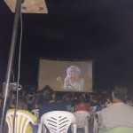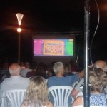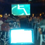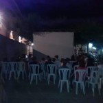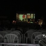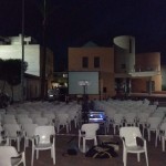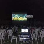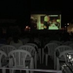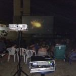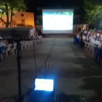 La imagen muestra un evento organizado por MovieMovil en homenaje a los marineros durante el día de su patrona. Un proyector montado en un soporte está preparado para proyectar contenido en una gran pantalla, mientras el público se encuentra sentado en sillas de plástico, disfrutando del ambiente nocturno. Las luces decorativas suspendidas sobre el espacio añaden un toque cálido y festivo al evento. MovieMovil, la empresa de cine al aire libre, demuestra su compromiso con la comunidad al participar en celebraciones significativas como esta.