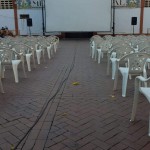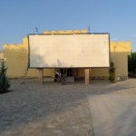 La imagen muestra una pantalla de cine al aire libre instalada en el antiguo campo de fútbol de Monóvar. Varias sillas de plástico blanco están siendo colocadas para acomodar al público. Se aprecia el desgaste en la pintura de la pared y algunos elementos como aire acondicionado y carteles decorativos. MovieMovil, la empresa de cine al aire libre, organiza momentos inolvidables bajo las estrellas con atención al detalle