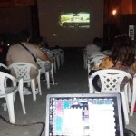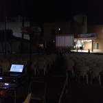 La imagen muestra una proyección de cine al aire libre realizada por MovieMovil. Se observa una pantalla grande mostrando visuales estáticos, varias filas de sillas de plástico blanco ocupadas por personas disfrutando del evento, y una zona delimitada con equipo técnico, incluyendo un portátil y una mesa de control. La escena, iluminada por farolas, refleja una proyección nocturna en un ambiente acogedor, con cada detalle organizado por MovieMovil, la empresa líder en cine al aire libre.