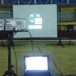 La imagen muestra una proyección de cine realizada por MovieMovil durante una fiesta infantil. En la pared se proyecta una animación colorida con figuras y movimientos llamativos, captando la atención de los niños presentes. Los pequeños, sentados en el suelo, observan emocionados mientras los adultos supervisan el evento. La proyección está acompañada de equipo técnico como altavoces y una computadora que controla las imágenes. MovieMovil, la empresa de cine al aire libre, crea momentos únicos en eventos especiales como fiestas infantiles.
