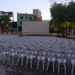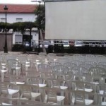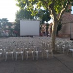 La imagen muestra un evento de cine al aire libre organizado por MovieMovil en Banyeres de Mariola. Una gran pantalla blanca está montada en la pared de un edificio de ladrillo con columnas blancas, mientras filas de sillas blancas están dispuestas para los asistentes. El entorno incluye árboles y un espacio abierto que crea un ambiente relajado y comunitario. MovieMovil, la empresa de cine al aire libre, convierte espacios cotidianos en escenarios perfectos para disfrutar del séptimo arte.