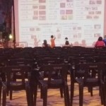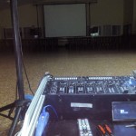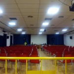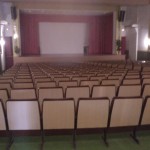 La imagen muestra un evento de cine organizado por MovieMovil en la Casa de Cultura de Onil. En el escenario, una gran pantalla blanca está lista para proyectar una película, flanqueada por altavoces que aseguran una experiencia de sonido envolvente. Las filas de asientos están dispuestas en niveles, ofreciendo una vista cómoda para todos los asistentes. La iluminación del techo y el diseño del espacio reflejan un ambiente profesional y acogedor. MovieMovil, la empresa de cine al aire libre, adapta sus proyecciones a espacios culturales emblemáticos como este, creando experiencias inolvidables.