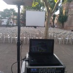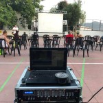 La imagen captura uno de los montajes de cine al aire libre organizados por MovieMovil. Se observa una gran pantalla proyectando un video, con varias filas de sillas blancas esperando al público. En primer plano, hay un proyector montado en un soporte junto a equipos técnicos, incluyendo un portátil y una mesa mezcladora de sonido. En el fondo, el lugar está iluminado por farolas, con árboles y edificios creando una atmósfera ideal para disfrutar de una experiencia cinematográfica bajo las estrellas. MovieMovil, la empresa de cine al aire libre, transforma cualquier espacio en un evento inolvidable