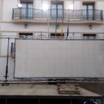La imagen muestra el proceso de montaje de una pantalla de cine al aire libre en la plaza del Ayuntamiento de Elda. Una persona está en una escalera ajustando la pantalla blanca, que está instalada en la fachada del edificio. El entorno incluye banderas y detalles arquitectónicos que reflejan el carácter público del espacio. Este evento organizado por MovieMovil promete transformar la plaza en un escenario cinematográfico único, ofreciendo una experiencia comunitaria inolvidable.