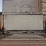 La imagen muestra el proceso de montaje de una pantalla de cine al aire libre en Ibi, organizado por MovieMovil. Una persona, vestida con una camiseta roja y pantalones oscuros, está arrodillada en una plataforma de ladrillo ajustando una gran pantalla blanca. El escenario tiene una pared frontal con graffiti que añade un toque urbano al entorno, mientras que al fondo se observa una puerta grande de ladrillo. Este evento promete convertir el espacio en un lugar mágico para disfrutar del séptimo arte bajo las estrellas.