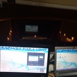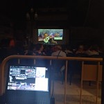 La imagen muestra la zona de control técnico y concesión organizada por MovieMovil en un evento de cine al aire libre. Bajo una carpa iluminada se encuentra el equipo técnico, con pantallas y controladores, junto a una máquina de palomitas y contenedores de refrescos. Varias personas están trabajando en la zona mientras se observa la gran pantalla de proyección en el fondo. MovieMovil, la empresa de cine al aire libre, ofrece una experiencia completa cuidando cada detalle técnico y gastronómico.
