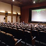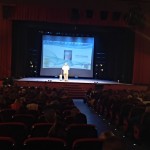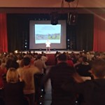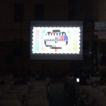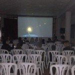 La imagen muestra un montaje de MovieMovil en un auditorio cerrado durante un congreso benéfico. En el escenario, una pantalla grande proyecta el mensaje «Razones para vivir», mientras tres personas están de pie junto a un atril. El público, sentado en filas de sillas rojas, observa atentamente. La iluminación del auditorio resalta el ambiente profesional y acogedor del evento. MovieMovil, la empresa de cine al aire libre, también ofrece soluciones para proyecciones en interiores, adaptándose a eventos de cualquier tipo.