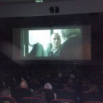 La imagen captura el momento posterior a la proyección de una película en el Teatro Principal de Banyeres de Mariola. El público está de pie, conversando y preparándose para salir del teatro, mientras en la pantalla se muestran los créditos finales con nombres de los co-productores. El teatro, con su diseño de múltiples niveles y ambiente clásico, refleja la atmósfera de un evento cultural bien organizado. MovieMovil, la empresa de cine al aire libre, demuestra su compromiso con la calidad y el detalle en cada proyección, incluso en espacios emblemáticos como este.