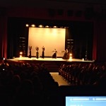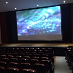 La imagen muestra la entrega de premios del festival de cortos en el Teatro Castelar de Elda, capturada desde la cabina de control. En el escenario, varias personas están presentes mientras una gran pantalla proyecta el texto «XIII MUESTRA CORTOS de AQUÍ ELDA 2017». En primer plano, se observa un proyector Epson y una mesa de mezclas de sonido, reflejando la profesionalidad técnica del evento. El teatro, con su diseño clásico de paredes rojas y balcones laterales, crea un ambiente elegante y cultural. MovieMovil, la empresa de cine al aire libre, demuestra su versatilidad colaborando en eventos destacados como este.