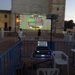 La imagen muestra un evento de cine al aire libre organizado por MovieMovil en Beneixama, junto a la pared de su castillo. Una gran pantalla proyecta una película mientras el público disfruta sentado en sillas blancas. En primer plano, se observa un equipo técnico gestionando la proyección con un portátil y un proyector bajo una carpa. El entorno histórico del castillo añade un toque especial al evento, creando una experiencia única que mezcla cultura y entretenimiento. MovieMovil, la empresa de cine al aire libre, transforma espacios emblemáticos en escenarios cinematográficos inolvidables.
